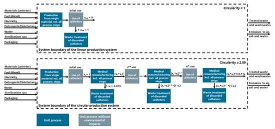 For the combination of LCA and circularity, the average path length is used to set the system boundaries. In particular, the investigated product system is expanded from one product cycle to the average number of passed product cycles that occur due to circulating a product through remanufacturing (calculated with Equation (1)). Subsequently, the environmental impacts are calculated according to the path length of the linear and circular production system. However, after modeling the average path length, including multiple product cycles, the analyzed impact categories’ results are divided through the respective calculated circularity to receive the same functional unit as described in Section 2.1, namely the provision of one catheter. This proposed modeling approach can be used to understand the environmental consequences of applying a linear or circular production system, including multiple product cycles resulting from remanufacturing in this study.