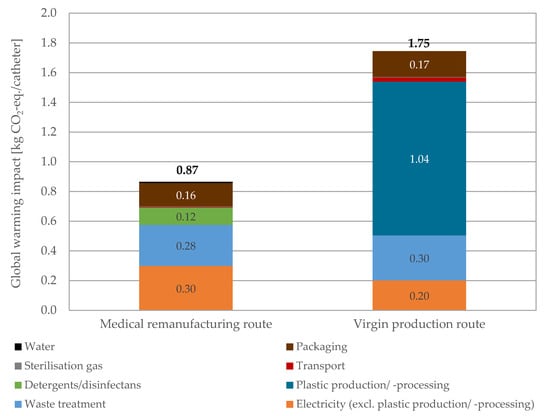 As shown in Figure 5, the production and processing of the plastics (dark blue) for producing a virgin catheter is most contributing to the GWI of using a newly-manufactured catheter for single-use (59.4%). The carbon footprint of the plastic production and processing for a newly-manufactured catheter (1.04 kg CO2-eq./catheter) is greater than the GWI of the entire medical remanufacturing process (0.87 kg CO2-eq./catheter). In the medical remanufacturing route, electricity consumption contributes the most to the GWI (34.5%), followed by waste treatment (32.0%) and packaging materials (18.2%). The GWI of the waste treatment (light blue) is similar for the medical remanufacturing (0.28 kg CO2-eq./catheter) and the new production (0.30 kg CO2-eq./catheter). The reason for this is the loss rate of the collected but not-remanufactured catheters in the medical remanufacturing process (47.9%). Approximately two catheters have to be collected for each remanufactured catheter. It follows that approximately one collected but rejected catheter for each remanufactured catheter is treated as waste. For each remanufactured catheter, approximately one catheter is treated as waste resulting in similar GWIs caused by waste treatment in both routes. The savings achieved by using a catheter from medical remanufacturing compared to virgin production are 0.88 kg CO2-eq./catheter or 50.4%. The findings suggest that the environmental benefits result from avoiding virgin plastic production and processing when using a virgin catheter. The contribution to the GWI from the transport (<2%) and sterilization process (<0.5%) are negligible in both manufacturing routes. The plastic PEI causes 56.9% of the GWI (90.9 wt.% per catheter) in the virgin production route. In the case of using a catheter from virgin production, the main contributing processes (>10% to the total GWI) plastics production and processing, electricity provision (excl. plastics production and processing), packaging materials, and waste treatment account for about 98.2% of the total GWI. In the medical remanufacturing route, the main contributing processes cause 98.1% of the GWI is caused (electricity provision, waste treatment of discarded catheters, packaging materials, and the use of cleaning and disinfecting agents).