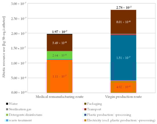 The second analyzed impact category is abiotic resource use. Figure 6 shows that using a catheter from medical remanufacturing causes lower environmental impacts concerning abiotic resources (1.97 × 10−7 kg Sb-eq./catheter) than using a virgin-produced catheter (2.78 × 10−7 kg Sb-eq./catheter).