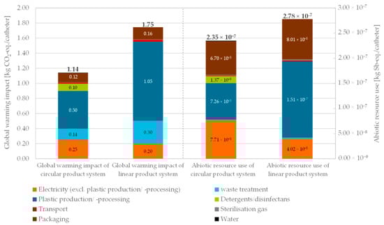 In this section, the environmental impacts caused by a linear production system is compared to a circular production system where the remanufacturing of catheters takes place according to the analyzed remanufacturing process. According to the described method of combing the circularity metric from Figge et al. [] and LCA, the impact assessment results show that savings can be achieved in the circular production system, including medical remanufacturing in both analyzed impact categories compared to the linear production system. In Figure 7, the results of the linear and circular production systems considering the GWI are depicted on the left primary y-axis and the results of the abiotic resource use are shown on the right secondary y-axis.