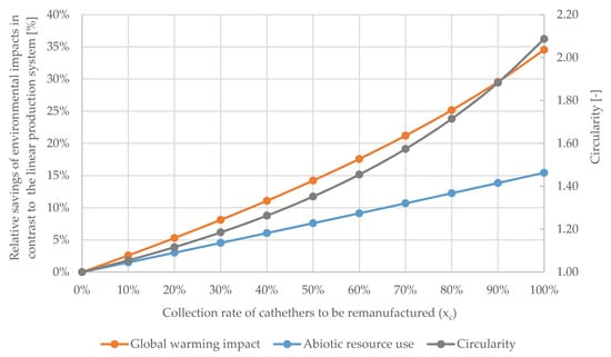The two scenarios (linear and circular production system) represent two reference values that reflect the environmental impacts in the analyzed impact categories if either none (0%) or all (100%) of the catheters are collected for medical remanufacturing. In reality, however, the collection rate of catheters for remanufacturing might be below 100%. Thus, in a particular economic area, the transformation from a linear to a circular production system might lie in-between the depicted values shown in Figure 7. In order to provide information for policy and other decision-makers, we conducted a sensitivity analysis varying the collection rate (xc) of the catheters from 0% to 100% and calculated the resulting relative savings in both analyzed impact categories (Figure 8).