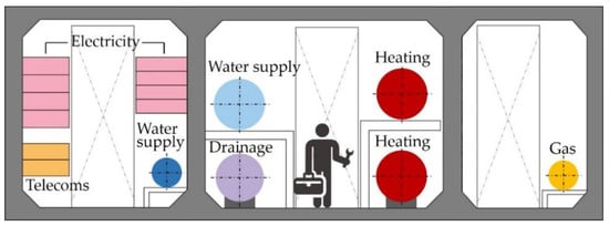 Urban utility tunnels (UUTs) have been gradually adopted as a sustainable solution for providing municipal services since the late 19th century []. Different urban pipelines can be integrated together in an easily accessible tunnel space to replace traditional overhead transmission lines or trench opening systems as shown in Figure 1 []. People can routinely maintain or renovate utilities inside the tunnel without interfering with the normal traffic and environment on the ground. Therefore, pipeline failures can be dramatically decreased, which means a longer asset life and fewer maintenance costs []. Due to fast urbanization and outdated planning, utilities can be interlaced with each other under roads, leading to the complicated “spaghetti subsurface problem” and hindering further development [,]; by means of UUTs, this annoying problem can be effectively resolved, and extra subsurface space will be saved for other underground facilities in the future [,,]. However, these are the external benefits of UUTs which originally do not result in actual income.