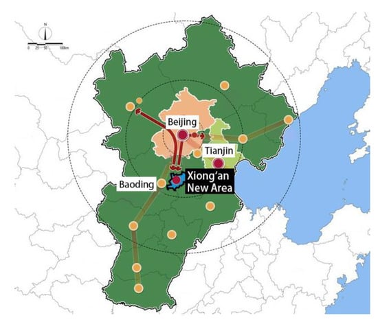 Xiong’an New Area, established in 2017, is located at the center of the triangular area formed by Beijing, Tianjin and Baoding, as shown in Figure 3. It is a new area of national significance which aims to relieve Beijing of non-essential functions in its role as China’s capital, and many of the construction standards for Xiong’an are the same as those for Beijing. It covers an area of approximately 2000 km2, of which 198 km2 is planned as the starting area and is now under construction. The central downtown of the starting area is estimated to be completed around 2035 with advanced urban infrastructure, including a large UUT network.