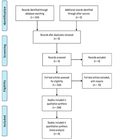 - Moher, D.; Liberati, A.; Tetzlaff, J.; Altman, D.G. Preferred reporting items for systematic reviews and meta-analyses: The PRISMA statement. PLoS Med. 2009, 6, e1000097. [Google Scholar] [CrossRef]