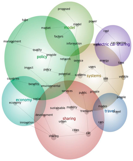 The concept »car« lies between the intersection of the themes »sharing« and »travel«. The concept »modes« lies between the intersection of the themes »sharing«, »travel« and »systems«. The concept »people« lies between the intersection of the theme’s» travel« and »systems«. The concepts »public«, »private« and »services« lie between the intersection of the themes »sharing« and »systems«. The concept »environmental« lies between the intersection of the themes »policy« and »sharing«. The concepts »potential« and »service« lie between the intersection of the themes »systems« and »policy«. The concepts »work«, »time« and »energy« lie between the themes »systems« and »electrical car sharing«. The concepts »market«, »factor« and »information« lie between the themes »model« and »policy«. Finally, the concepts »countries«, »social« and »benefits« lie between the themes »policy« and »economy«.