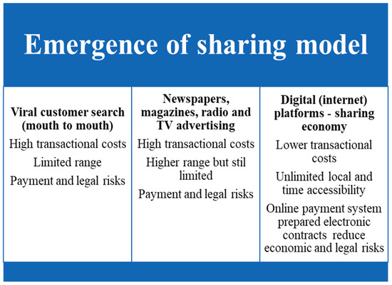 In the pre-internet era, the costs associated with finding partners for sharing and creating contracts were paramount. However, the risks associated with sharing before the internet were mainly related to the limited and more difficult to access information about the offer itself, the provider’s reliability, and the validity of the contracts [25]. The introduction of the internet has significantly impacted reducing transaction costs between unknown participants in the sharing process. From an economic point of view, transaction costs present all the costs and difficulties (risks) associated with carrying out an economic transaction [26]. In the pre-internet era, the costs associated with finding partners (in newspapers or from mouth to mouth) in the process of sharing and creating contracts were of utmost importance. In Figure 3 are exposed to the main characteristics of the sharing model development.
