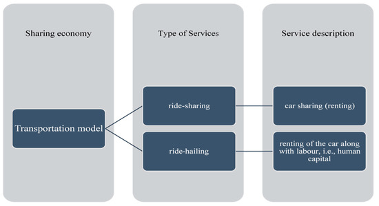 In the last ten years, two types of car sharing services in Europe (and the world) were developed. As shown in Figure 5, the transportation model is subdivided into so-called transportation by ride-hailing services, as is the case with Europe Uber and the US-based Lyft. Here, an object is rented together with labor, i.e., human capital, and implies, for example, the rental of a car or other vehicle with the person driving it [40]. In Europe, there is an outcry among taxi drivers because, in their opinion, Uber provides taxi services without a license [41].