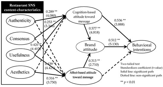 The purpose of this study is to examine four characteristics of social media content and their effects on restaurant patrons. The characteristics we examine in our study are authenticity, consensus, usefulness, and aesthetics. More specifically, the study investigates how content characteristics influence consumers’ cognition-based and affect-based attitudes toward the message, which, in turn, influence brand attitude and behavioral intentions. Data were collected from 376 respondents who had frequented restaurants on a regular basis and used social media networks for at least one year. Structural equation modeling with AMOS 22.0 was used to analyze the data. The most important content characteristic that influences both cognition-based attitude and affect-based attitude is usefulness. All three other content characteristics (authenticity, consensus, and aesthetics) are also found to have a significant impact on either cognition-based or affect-based attitudes. While both cognition-based and affect-based attitudes have a significant effect on brand attitude, the effect of affect-based attitude is fully mediated by brand attitude in influencing behavioral intentions. The mediating role of brand attitude is also examined.