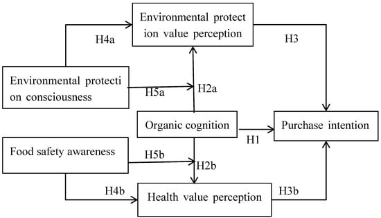Environmental protection consciousness refers to people’s consciousness of constantly adjusting their economic activities and social behavior to protect the environment. Consumers with higher awareness of environmental protection are often able to understand the current situation and consequences of environmental deterioration more clearly, understand the importance and urgency of environmental protection and may give a higher evaluation of the environmental value of organic food, while consumers with lower awareness of environmental protection have a relatively vague understanding, and their perception of the value of environmental protection may be more negative. Food safety awareness refers to the degree of consumers’ attention to food safety issues, which also reflects the extent to which consumers attach importance to diet health. Consumers with stronger food safety awareness are more skeptical about the safety of conventional food and can feel the value of the health properties of organic food more deeply []. Hence, even at the same level of organic cognition, the value perception of consumers with different food safety awareness and environmental awareness will be different. Based on this, the following assumptions were put forward in this paper: