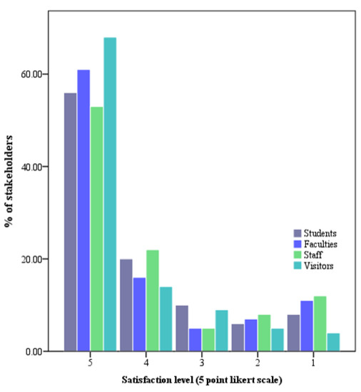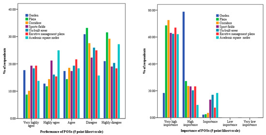 - Among all POS types on the university campus, the highest importance has been given to gardens (4.8), followed by corridors (4.7) and plazas (4.6). More than 70% of stakeholders are aware of the benefits of POSs. Most of the POS types are used for exercise (65%), followed by study (15%), and gathering with friends (15%);