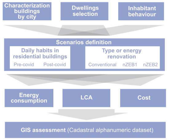 The proposed methodology allows us to assess the environmental, energy, and economic implications for an unexpected situation, such as COVID-19 crisis, that completely changes the daily routines of a city, a country, a continent, etc. This methodology is based on a flexible aggregated model that works from the building to an urban scale. Therefore, it allows us to obtain relevant physical characteristics of the buildings’ stock of a city from cadastral data, and estimate the energy, environmental implications, and cost implications of their renovation. The methodology is universal, and their flexibility in scenarios and renovation definition allows us to apply other European countries, even the study of the effect of changes in life habits not related to the pandemic. The obtained results are georeferenced by facilitating the understanding of results by stakeholders and policy makers and being possible to identify priority areas to intervene. However, this methodology is not exempts of limitations. Working with energy models of the dwellings, as well as of the building stock model, imply a simplification of the complex urban reality. Future research could deal with the relationship between these energy performance models and real consumption data at an urban scale, in order to test and refine their effectiveness. Furthermore, the extrapolation at an urban scale could consider more urban attributes, such as urban morphology, demography, or other socio-economic/spatial patterns that could help to obtain more fine grain results.