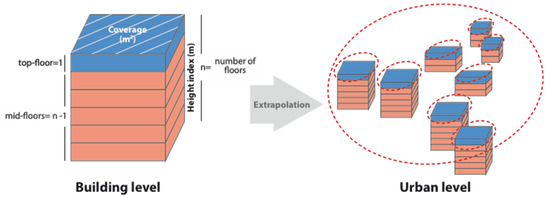Based on the calculated physical characteristics of each building, several floors are assigned from the height index and considered 3 m as the average height of each floor [32]. All buildings have a top-floor, with different consumption patterns from mid-floors, but with the same coverage (Figure 2). Based on that, the energy consumption of each building is determined. With respect to LCA and cost for each renovation, it is calculated using the heated envelope, differentiated by façade, roof, and windows. The ventilation system is installed for the nZEB2 renovation proposal.
