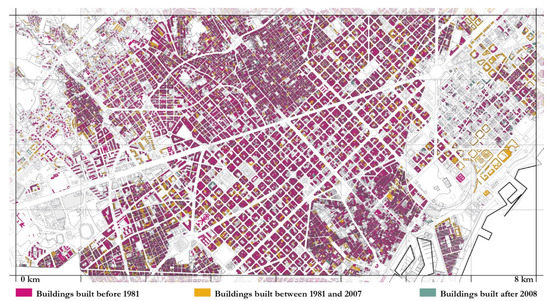 In Figure 3, buildings have been coloured in different tones according to the groups defined by age of construction and the data is shown in Table 6. The data obtained reveal the aging of residential buildings in the city of Barcelona. As such, 87.6% of residential buildings were built before 1981, 11.1% were built between 1981 and 2007, and only 1.3% were recently built, in the line of other studies [66]. The results change slightly when the percentages of dwellings are analysed since the buildings built between 1981 and 2007 are blocks with a greater number of dwellings than those built in previous years and, therefore, the percentage increases slightly to 13.8%. Dwellings built before 1981 represent 84.3% of the city’s building stock and those built after 2007 represent only 1.9% of all city buildings.