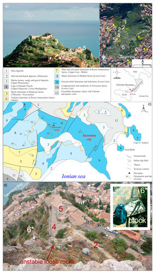 As a part of human history, cultural heritage represents a treasure deserving protection and careful management to ensure its transfer to future generations. Historical sites are often cultural tourism destinations, and their safe fruition is a priority for local administrators. In mountainous settings, where often historical buildings have been erected for strategic purposes, one of the most recurring threat is represented by landslides and, more specifically, rockfalls [1,2,3,4,5,6,7,8]. Such mass movements are often the expression of a risk [9,10,11,12,13], which often compromises the fruition of the good, leading to a cultural defeat for our generations. This is the case of the cultural heritage perched on the top of a carbonate cliff facing the Ionian coastline of Sicily (southern Italy), and dominating the town of Taormina. It is the Saracen Castle, an example of the defensive architecture of the XII and XIII centuries, which is part of the monumental park of Taormina. This little town is considered as a natural fortress of great strategic and political importance, and it has been included in the tentative UNESCO world heritage list to be placed under consideration as a possible nominee. This adds relevance to the already worldwide known touristic importance of this place, visited by millions of tourists every year. The rockfall problem has been affecting the castle cliff for decades, with falling blocks, even of considerable volume, reaching the downstream public infrastructures and private structures, and threatening its safe fruition [14,15]. Some rock mass stabilization works were carried out in recent years to stabilize the southern and eastern cliff sectors and to protect some private houses. Nevertheless, the access road path to the castle, along with a panoramic viewpoint and a small rock-hewn church representing tourist destination for their suggestive view and naturalistic impact, are still under the impending unstable rock threat. The main difficulty in the study of such unstable rock cliff is represented by the bad accessibility of the highest rock mass portions, where most of the loose rock blocks stand in unstable condition. In fact, the only survey spots are a few rock outcrops located at the foot of the cliff, which can be surveyed by operators on the ground. In this paper, the geomechanical asset of the cliff bordering the access path to the castle is defined according to the combination of in situ and remote surveys. In the latter case, an Unmanned Aerial Vehicle (UAV) has been employed to reach the highest sector of the cliff and to achieve a close view of the top rock mass conditions. UAV systems were initially employed for military purposes [16] and then, due to their practical utility, were extended to archaeology and cultural heritage mapping, environmental surveys, urban monitoring and tridimensional reconstructions [17,18,19,20,21,22,23,24]. The literature shows that optical imagery and, more generally, remote sensing procedures, have been employed in rockslide surveys [25]. Brückl et al. [26] took advantage of photogrammetry to reconstruct the kinematics of a deep-seated landslide, while Collins and Stock [27] employed terrestrial laser scanning for the hazard assessment along cliffs. Similarly, 3D geometrical data were achieved by some authors [28,29] through automated, or semi-automated, approaches. With specific reference to rock cliffs, Sturzenegger and Stead [30] and Riquelme et al. [31] analyzed rock mass discontinuities through terrestrial photogrammetry coupled with laser scanning and 3-D point clouds, respectively. Mancini et al. [32] investigated the integration between UAV photogrammetry and geomechanical modeling of coastal rock cliffs proving its utility for finite element stability analysis. In the literature, some cases of integration between UAV and ground surveys, with specific references to the successful fracture mapping [33] and rockfall instability study [34,35,36,37], prove the utility of aerial photogrammetric surveys in hardly accessible areas, highlighting also the need for accurate model calibration and validation to achieve reliable results. For example, Salvini et al. [33] proved that UAVs can significantly improve the collection of geometric and structural data when integrated with information from traditional engineering geological surveys, which is one of the main scientific goals of this paper. Robiati et al. [36] provided a back analysis rockfall study through 3D photogrammetric remotely sensed data highlighting the possibility of achieving reliable models after a careful calibration of input parameters. Nevertheless, Rodriguez et al. [37] strengthen the fact that UAV surveys should not replace or undermine the importance of site inspections; rather, it enhances the information to make better decisions. To this end, in this research, from the point cloud achieved by UAV survey, the orientation in the space of the most visible planes has been extracted and compared to those surveyed on ground for a critical evaluation of the scientific and technical utility of potential stand-alone UAV surveys. Based on the achieved geostructural data, the main kinematic unstable patterns were highlighted to find out the entity of the rockfall threat. This activity was sided by rockfall simulations aimed at evaluating the impact of potential rockfalls on the access road path and structures, which led to the suggestion of the most suitable stabilization works for the cliff securing and the sustainable fruition of the cultural heritage.