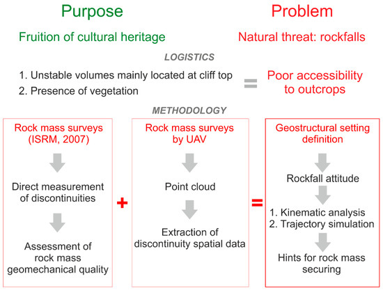 In mountainous areas around the world, dealing with rockfalls means facing some technical survey difficulties due to the low accessibility of areas and the height of slopes. If a cultural heritage is also threatened by such mass movement, the need of specific survey solutions, even in a combined asset, is required. This paper deals with the integration of ground and UAV rock mass surveys aimed at defining the rockfall attitude of an unstable rock cliff sector hosting an example of cultural heritage in tourist area of southern Italy, whose fruition has already been threatened by the occurrence of rockfalls. As an example of the defensive architecture of XII and XIII centuries, the Saracen Castle in Taormina is reached by hundreds of visitors each year, but its access path and the surrounding area are threatened by the unstable condition of the cliff, hosting unstable rock volumes on kinematically critical planes. In order to achieve a reliable geostructural setting of the cliff, aiming at its possible securing through proper mitigation works, ground rock mass surveys could not provide enough information due to the bad accessibility of the rock faces. Therefore, a survey by an Unmanned Aerial Vehicle, with a reliable verified accuracy, was carried out to map the discontinuity planes especially occurring at the highest portions of the cliff, achieving geostructural data of different fronts of the cliff. Ground and aerial data were combined and statistically analyzed to define the main kinematic failure patterns. In this perspective, a critical comparison between the two employed surveying methodologies is proposed herein, highlighting that both approaches are affected by potential and limitations and that the integration of the mutual dataset represents a suitable solution for a complete rock mass characterization in this type of areas. Furthermore, rockfall simulations allowed ascertaining that potential falling blocks would cross the access path to the castle, thus representing a natural threat to the fruition of cultural heritage, thus proving the need of mitigation measures to ensure the safe fruition of the cultural heritage.