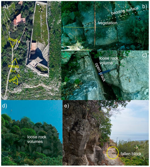 Representative rock masses surveyed by ground; (a) location of the shots reported in insets, (b) scanline and evident dip-slope bedding plane, (c) discontinuity showing a wide aperture, (d) loose blocks and vegetated spots, (e) block fallen and stopped along the access path.