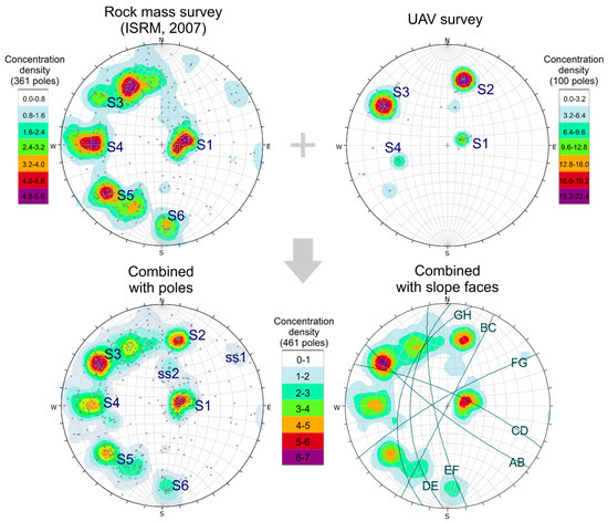 Besides the number of poles, which is a matter of number of surveys, a further difference refers to the reliability of data. By comparing the two stereograms it is evident that S5 and S6 discontinuity systems are missing in the UAV output. Similarly, the S2 set is not well marked in the rock mass survey stereogram, although some poles can be referred to this family. By combining the two data sets, a unique stereogram was obtained, with the evidence of six main discontinuity sets, along with a relevant number of scattered poles (Figure 5). The latter could not be grouped into “main” systems due to a poor statistical contouring, but they are index of a complex geostructural setting of the rock cliff. In this case, the most significant two “secondary” clusters were labeled as ss1 and ss2.