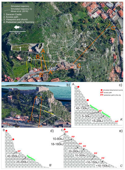 Simulated rockfall trajectories crossing the main elements at risk. (a) 3D simulated trajectory, (b) trace of the simulations crossing the access path, (c) A-A’ profile simulation, (d) B-B’ profile simulation, (e) C-C’ profile simulation.