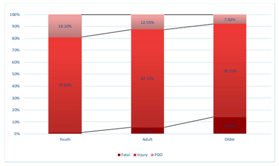 The proportion of crash severity in each age.