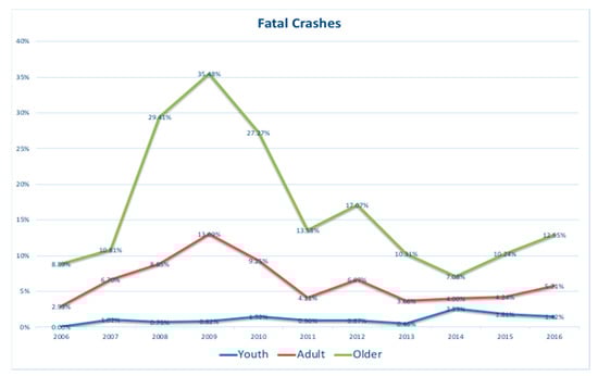 Figure 3 shows the proportion trend of the fatal crash in different age groups in the 11 years. The green line indicates that the proportion of older pedestrians’ fatal crashes is higher than in other age groups in the 11 years. Moreover, it reaches a peak in 2008, 2009, and 2010, then the proportion of fatal crashes decreased in the next few years. Since 2015, the ratio of the fatal crash of older pedestrians has gradually increased.