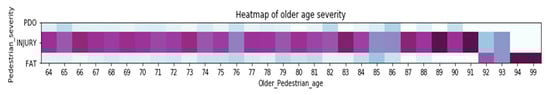 In terms of gender, the severity of pedestrian traffic crashes is higher in older men than in women. Tatok analyzed 4829 pedestrian traffic crashes from 2011 to 2012 provided by the Chicago Police, and applied multiple Logit models, mixed Logit models, and potential category Logit models to study the impact of age and gender on the results of pedestrian traffic crash severity [18]. Older pedestrians are more likely to have fatal crashes, and older male pedestrians are more severe than females [19,20].