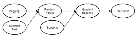 Figure 7 shows the evolution of the XGBoost algorithm. All the algorithms shown in Figure 2 are based on the Decision Tree. The Decision Tree is a single system making decisions based on all data features. While the Decision tree is a single system that makes decisions based on all data features, the Bagging method joins the voting process to multiple decision trees, improving on them. Then Random Forest combines the advantages of Bagging and Decision trees but makes decisions based on a subset of randomly selected features. On this basis, Gradient Boosting Method (G.B.M.) forms a powerful tree-based learner through continuous iterations of the gradient optimization algorithm. The result is XGboost, which builds on the combination of software and hardware optimization techniques, is more powerful, faster than other GBM.s, and is capable of both regression and classification problems.