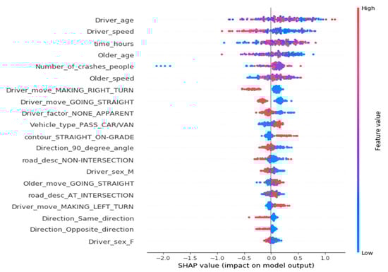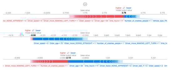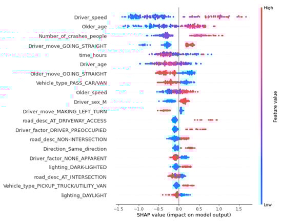 Suppose older crash is, the feature of the older crash sample is , the predicted value of the model for this sample is , and the baseline of the entire model is , is SHAP value of , which is the contribution of the older pedestrian crash feature in the older crash to the final predicted value. Each older-related feature’s SHAP value represents the change of predicted probability by the interpreted model based on this feature. In each function, the SHAP value describes each feature’s contribution to illustrate the difference between the average model prediction of the sample and the actual prediction. indicates that this feature increases the predicted probability, and conversely, it suggests that this feature has a negative contribution.