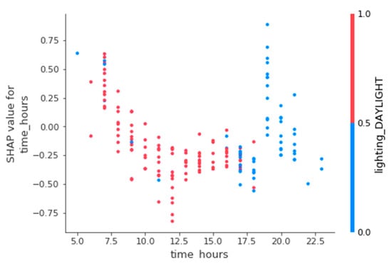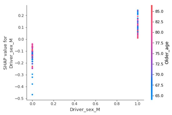 Since the summary plot can only investigate the correlation between the severity level and the features, it is hard to observe the relationship between pairs of features. SHAP dependency plots show the relationship between some features and how they impact one’s probability for the severity level of the older pedestrian crash. Figure 14 and Figure 15 show the impact of driver gender and the impact of the crash time on the predictions. The left side y-axis is the impact value of the single feature. The x-axis is the value of this single feature. The right-side color bar is the value indicator of the second feature that may affect the single feature. Figure 14 shows that when the gender of drivers is female, and the older pedestrian is relatively young, the negative SHAP value means that the probability of fatal crashes of older pedestrians can be reduced. The reason may be because female drivers are more likely to maintain regular living habits and good driving habits [54,65], which can effectively reduce improper driving behaviors in driving and avoid fatal crashes of older pedestrians. Compared with those two clusters in Figure 13, it is interesting to find that both driver genders’ impact with relatively old age is approaching SHAP value 0. Crash factors for very aged pedestrians at the time of the collision were independent of driver gender. Still, a female driver encounter with a relatively young older pedestrian may lower the risk of being involved in a fatal crash. In comparison, male drivers’ impact with a relatively young older pedestrian is increased to positive values.