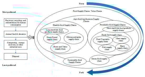 There have been some discrepancies in naming FSCs in recent research, such as studies using “agri-FSCs” [16] or “agri-business supply chains” [17] to emphasize the importance of the agriculture sector compared to manufacturing supply chains, or “food value chains” to evaluate FLW from the view of value and cost [18]. These expressions of supply chains in the food industry may or may not examine the same group of products. Generally, characteristics and categorization of food products are two dimensions to be considered when naming FSCs in different studies.