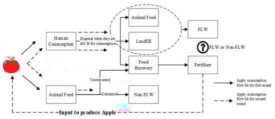 We describe a two-round consumption flow, which also could have practically infinite rounds. According to the FAO’s definition, if one round of consumption is considered, the apples that go to the disposal stage, even they are still fit for consumption, are counted as FLW. However, in the two-round consumption scenario, whether we should calculate the products generated from food recovery as FLW or non-FLW depends on the next consumption pathway. In this context, the FAO’s definition creates difficulties in FLW cost and volume calculation from tracking and tracing the products’ flow, and different results from open-loop or closed-loop supply chain perspectives.