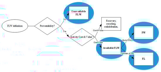 The key question in Figure 3’s flow is whether the fertilizer as an input to produce apples is counted as FLW. According to the definition, if the fertilizer, which is a type of recovered food product, goes to human consumption without being disposed of, it should be treated as non-FLW. But what if its output goes to landfill or animal feed? Thus, the FAO’s definition may create some difficulties in FLW calculation from three points: underestimating FLW cost when economics losses occur under the circumstance that the food recovery process costs more than other alternative inputs, tracking and tracing the product flow in each FSC stage, and different results stemming from an open-loop supply chain perspective or closed-loop supply chain perspective. In order to standardize the FLW definition, we suggest considering three points: cost and value, preventability, and the FSC stages, as described in Figure 4.