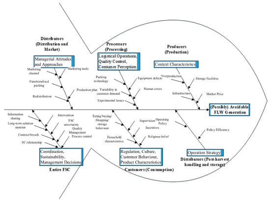 Besides the key factors above, we summarized other factors coming from the literature; see [23,44,71,73,74,75,76,77,78,79], shown in Figure 6. This fish-bone frame helps researchers to comprehensively understand the possible root causes of FLW generation from the perspectives of both a specific FSC stage and the entire FSC.