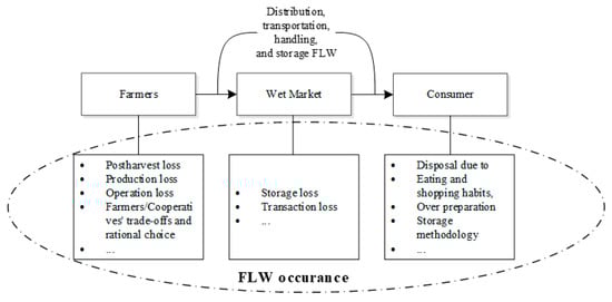 A direct and traditional FSC is characterized by a narrow distribution channel, which is normally led by farmers and traders. Direct sales in regional and local wet markets, corner stores, or roadside stands are primarily located close to the production region. The number of intermediaries is small, and Reardon [80] described it as “geographically short” and “intermediationally short.” The relationships between the seller and buyer are generally limited to simple spot transactions [1], and products delivered via this FSC are low cost and mainly targeted at lower-income urban and rural people [81,82] Figure 7 describes the FSC in the traditional mode and the possible FLW occurrence.