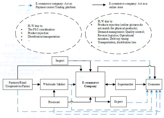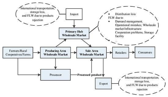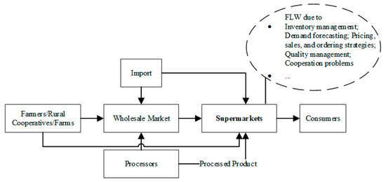 Figure 9 illustrates a brief FCS in which supermarkets are the core stakeholder. In this distribution mode, food products can be supplied by wholesalers, producers, importers, or even directly by farmers. In some cases, to ensure efficiency and quality, supermarkets, especially hypermarkets, can have their own distribution centers and contract farms. The FLW problems in this mode are to some extent associated with inventory, demand, quality, strategy, and cooperation issues.