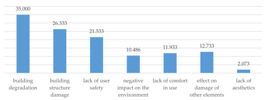 The abandonment of renovation works is an extremely important factor causing degradation of the building. The effects of failure to repair the individual building elements presented in Table 1 can be divided into catastrophic, serious, significant, and insignificant.