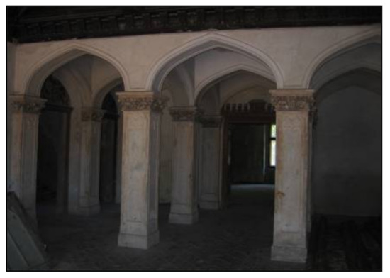 Before the building was profoundly rebuilt into a Neo-Gothic palace, it had been subjected to earlier modernization in 1791. The function of the building changed from defensive to residential. The reconstruction in the 19th century was not limited to introducing the new Neo-Gothic décor; it also covered enriching the bodies of the building with numerous annexes. The main body of the palace was coped with an attic crenellation. The tri-axial center of the façade and remaining elevations were raised and surrounded by pinnacles. The ogives main entrance was accented by a balcony placed above it, with a ceramic balustrade and griffins. The body of the building was decorated with annexes. On the north side, a tower was added on, which was four-sided in the lower part, with the upper transitioning into an octagon. A loggia was added to the tower on the north side. The east (garden) elevation was enriched by a protrusion with a balcony, the south elevation by two annexes lower than the body of the palace. The inside also received a new Neo-Gothic decor. The hall was divided into a front part covered by a wooden ceiling as well as a two-bay vaulted cloister supported by square columns and pilasters with decorative caps located further in. In the tower, in the south part of the building, in the basement, and on the ground floor, a colonnade running along the southern and western walls can be found. The arcades are supported by slender iron columns with caps covered by stylized floral ornamentation (Figure 3). The doors are decorated by a motive of ogives recesses, a stylized rosette, and crenellated lintels. The staircase leading to the upstairs is decorated by a forged balustrade (Figure 4).