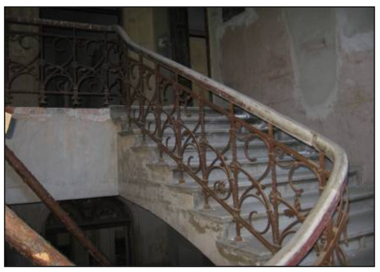 The construction of inside stairs in the northern part of the building is brick arched, supported by a steel beam with wooden treads and risers. The cast-iron balustrade contains a floral motive. Stairs in the south side of the building—reinforced concrete—were built in the 1980s. The outside stairs are concrete.