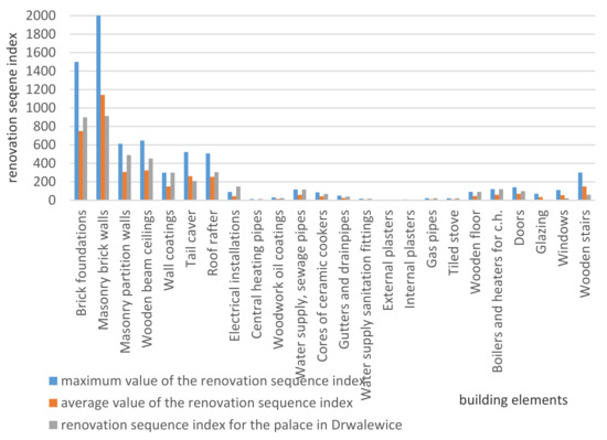 The minimum possible value of the renovation sequence indicator Mi results from the technical condition of the building element. If the degree of technical condition of any building element is defined as Sz = 0, then the Mi factor is also Mi = 0.