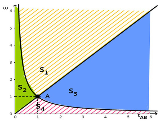 Under the mild penalty level (), S1 does not exist, and the possible equilibrium is S2, S3, S4. The analysis results are as follows: