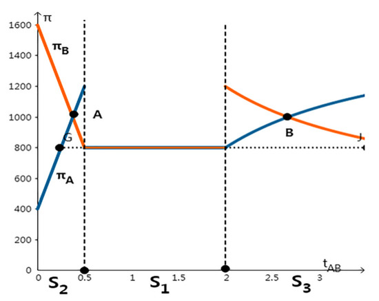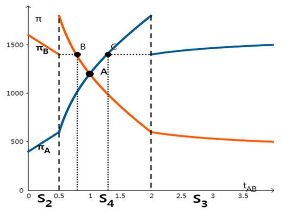 In the S4 equilibrium, as shown in Figure 3, the two companies earned the same utility and had the same technical level at point A. From Figure 3, we can see that under the mild penalty mechanism, the one with higher technical level will leak data, and the higher technical level company’s benefit of data sharing will be greater than that of the weak one. Meanwhile, on the left side of point B, if company A leaks data, the utility from data sharing of company B is higher than that of company A, which does not leak any data; the point C is the same as the point B. Therefore, under the control of the mild supervision mechanism, it is not possible to change the leakage behavior of the technology-dominant party, and there is also the default leakage of each other’s data.