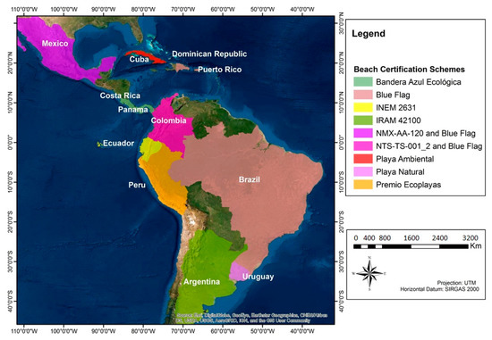 Figure 1. Geographical coverage of the nine beach certification schemes in Latin America [14].
