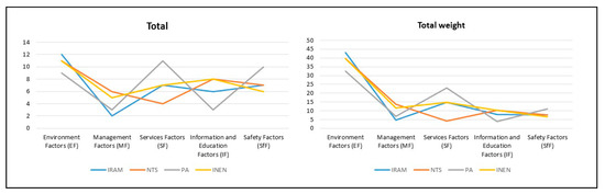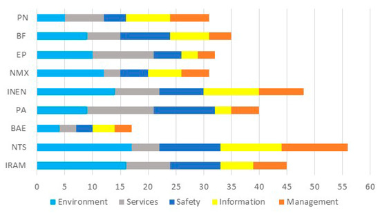 The category analysis, however, is more interesting than the total number. The tendency of each category is more clearly shown in the line graph of Figure 2. A deeper analysis reveals that the environmental category has the highest number of factors in most of the BCSs, demonstrating a significant interest of these schemes in environmental management, especially in the Colombian (NTS), Argentinean (IRAM), and Ecuadorian (INEM) schemes. The categories services and safety have an important number of factors in almost all the BCSs, although they are highlighted in the PAM certification and the Eco-Praias Award in relation to services and the NTS and the PAM certification in relation to safety. The category information and education is clearly the least specified factor in most of the BCSs. It is mostly addressed in the Colombian NTS, Ecuadorian INEM, and Uruguayan Playa Natural schemes. The category planning and management, which Botero and da Silva [37] considers crucial, is mostly considered in the NTS scheme.