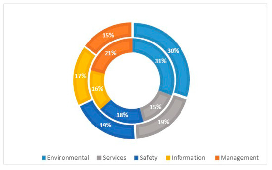 An additional descriptive analysis is related to the proportion of conformities of each certification, in each category, according to total requirements. As observed in the inner circle of Figure 3, two categories have a higher total number of factors (environment and management), while the other three have the highest average (services, safety, and information). This result shows the similarity between the BCSs and reveals as the total proportion of factors is broadly moderated in terms of average.