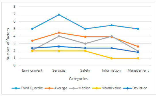 The central tendency measures were calculated to explain the statistical differences between each category by means of univariate descriptive analyses (Figure 4). Although these are ordinal data, the most representative measure is the median. Therefore, the third quartile was also calculated as a measure of location [41]. For the central tendency, the two categories safety and management had similar behavior in all three measures. For services and information and education, however, the average is practically the same as the median. This particularity indicates the category is less affected by extreme values, whether high or low, and the categories are more consistent in terms of proportion of conformity factors.