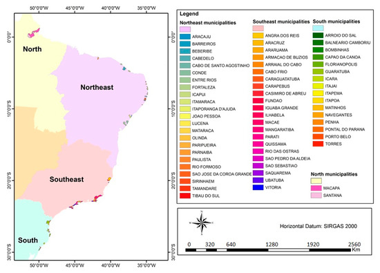 Brazil has 8698 km of coastline, of which 7635 km is relatively straight coastline and 1300 km is made up of bays and gulfs. The Brazilian coastline is divided into 395 municipalities and in four regions (south, southeast, northeast, and north) according to the common characteristics of each region [45]. This study focuses on 63 of the municipalities that joined the Orla Project voluntarily and designed and disclosed their integrated management plans. Figure 5 shows the analyzed municipalities with IMP by region. The northeast region is the most represented, followed by the southeast and south regions, while the north region has the least significant number of municipalities with IMPs.