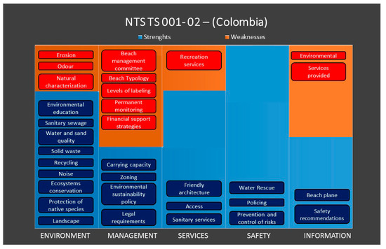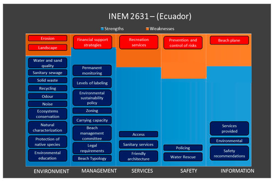 Another strength of the BCS INEN 2631 is the full set of standardized forms included with the norm, allowing each beach manager to survey information almost immediately. This particular aspect has been identified as a weakness of the other studied BCSs. Furthermore, INEN clearly defines the establishment of a beach management agency and its key actors responsible for administering and certifying beaches. According to Botero and da Silva [37], the beach management agency is a mixed administrative, non-profit body with participatory regimes and autonomy in its conformation and decisions regarding ICZM. It enables the control of system interactions and ensures their stability inclusively and independently. According to François [58], the beach management agency is a higher level of organization emerging from social systems based on a critical level of inter-relations. As defined by the WTO [59], beaches have a wide range of stakeholders and, therefore, require cooperation agreements to monitor interactions. This scheme was also considered the most comprehensive since it gathers environmental, tourist, safety, and management factors in almost equal proportions and relevance, thus indicating a focus on integrated coastal management. The weaknesses include an excessive number of requirements for the first level of certification, hindering its implementation. It also fails to include important aspects regarding erosion, landscape, and risk assessment and prevention plans.