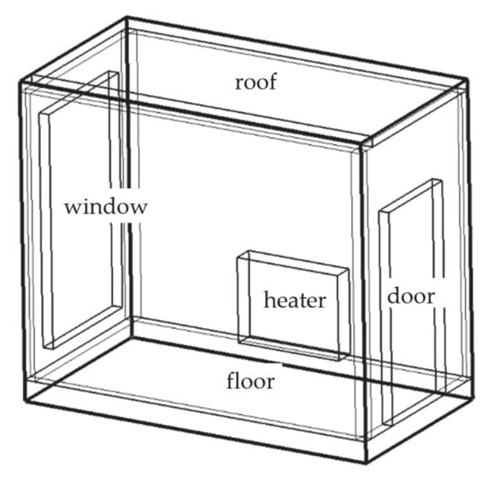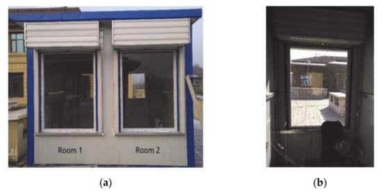 In order to verify the validity of the software model, a 3.5 m × 3.4 m × 3 m (length × width × height) experimental house was built on the roof of a college laboratory building and divided into two equally sized rooms—3.2 m × 1.6 m × 2.7 m (length × width × height)—by an intermediate insulation wall. Each room had a window measuring 1.2 m × 1.5 m (width × height) and a door measuring 0.97 m × 2 m (width × height). The WWR equaled 0.38, which is within the allowable range specified by the “Design standard for energy efficiency of public buildings” (GB 50189-2015) []. The experimental rooms’ structure is illustrated in Figure 1 and the building’s enclosure parameters are shown in Table 1.