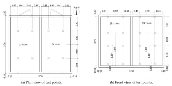 Pt100 resistance thermometers were used for taking temperature measurements. The recorded data represent the average temperatures of the measuring points. The temperature measurement accuracy was ± 0.1 °C. In order to obtain accurate temperature results, 64 Pt100 resistance thermometers and two THTZ temperature inspection instruments (Yuyao Tenghui temperature control instrument factory, Ningbo City, China) were adopted in two rooms to collect data for instant observation and recording. All the measurements were immediately saved on a memory card and displayed graphically on a computer screen to enable analysis of the test results. The air test points are shown in Figure 3, and the sizes shown in the figures reflect the locations of the resistance thermometers.