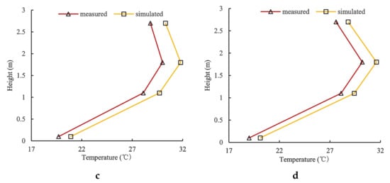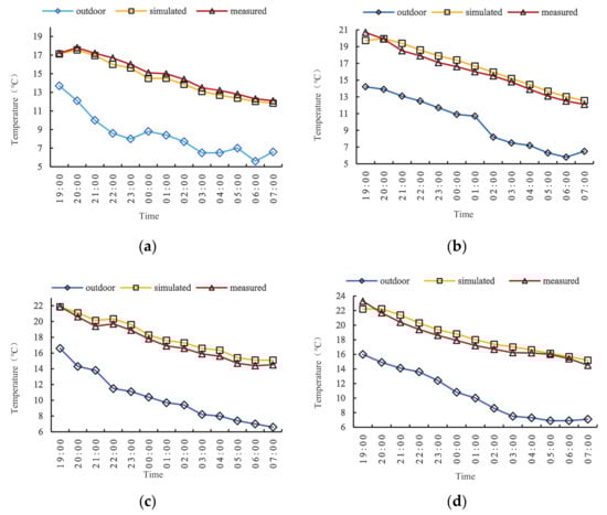 Comparison between simulated and measured temperature. Notes: (a–d) represent a room with insulated ESIW window structures (A, B, C, and D) respectively.