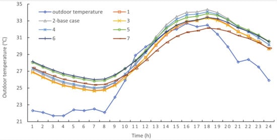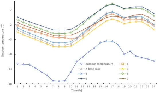 The natural hourly room temperature on 5 January (Figure 8) and 31 July (Figure 9), the coldest and hottest days of the year, respectively, was compared between the seven houses with different window structures.